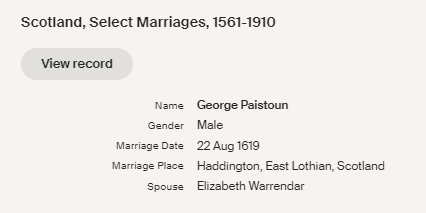 The name in 1641 is recorded as Paistoun, in Dalkeith. By the time Hew married Margaret Staige the name has changed. Margaret was born in Kirkcaldy in 1647