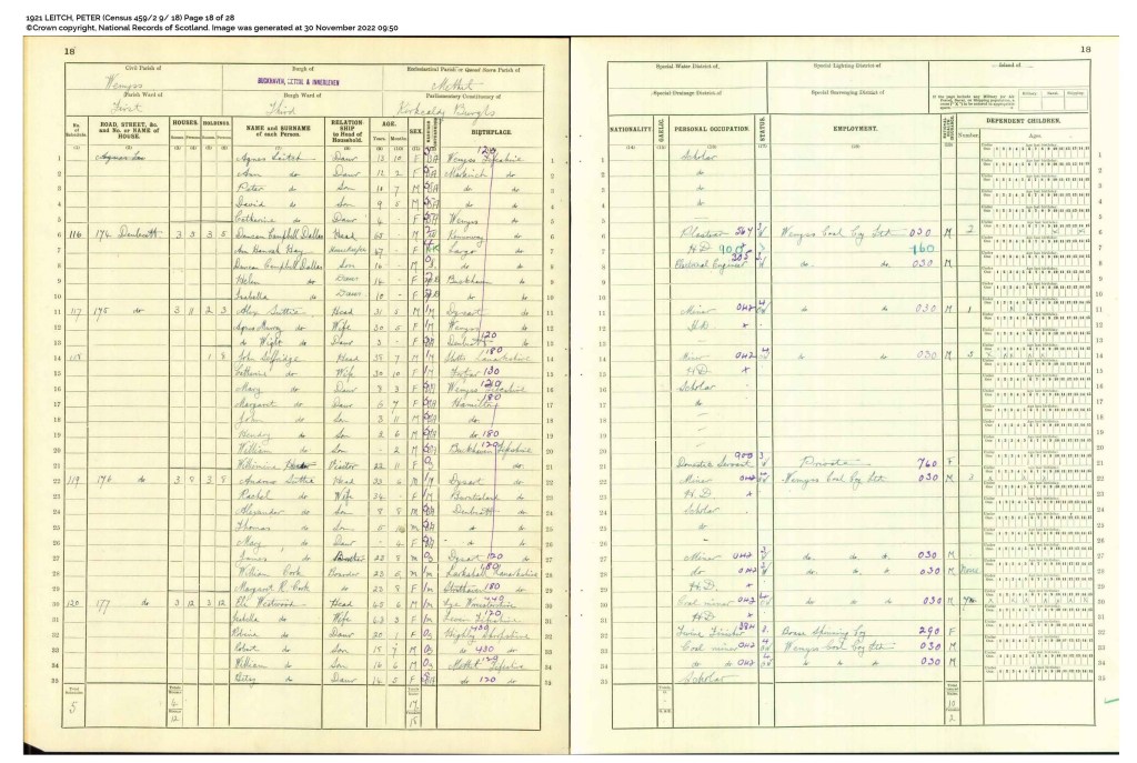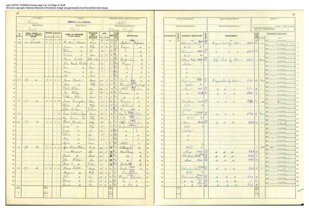 In the 1921 Census they had moved to 173 Denbeath. His brother’s John, Thomas and James were coal miners (Hewers) whilst Agnes, Ann, David and Catherine who were all at school. The house was owned my Wemyss Coal Company, his father was also Coalminer. Wemyss Coal Company built all the houses at Denbeath to house the coalminer’s. Most of the house are still there over 100 year later.