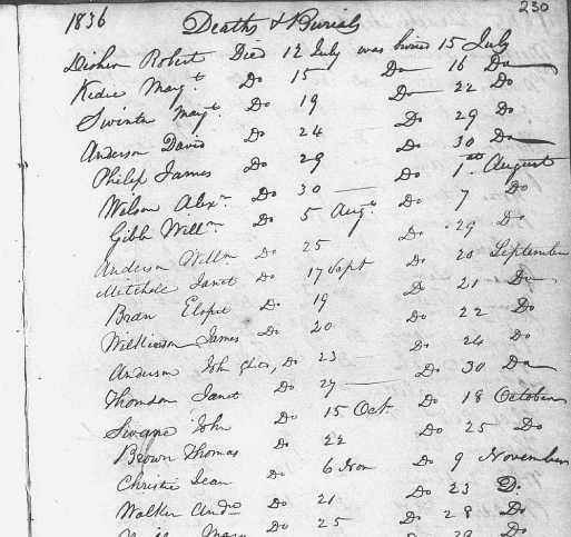 Unfortunately the last details I have found for James show that he was living in Abbey Park, Dunfermline (He would have moved to Dunfermline for work) and that he died on the 12th May 1834. James was buried in common ground, this was a paupers grave, he had no head stone. Due to the time frame of the emancipation and that the were “free from servitude” this could have resulted in James being a pauper at the end of his days. During this time people relied on the church for support if they were paupers.