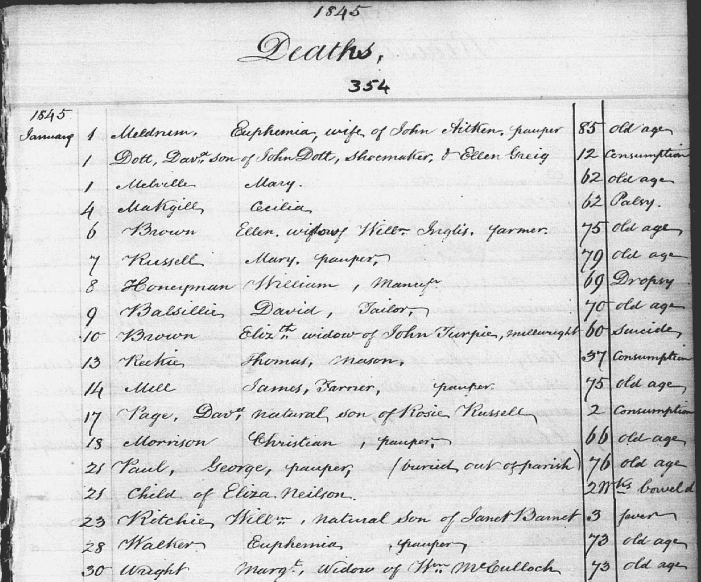 Andrew’s wife, Euphemia, died 9 years later in 1845 – she also died a pauper. This would be because she would have relied on the church for support once her husband died. I feel it is worth noting again that although a pauper is poor they may not have been poor throughout their life and only been a case of relying on the church for support in their twilight years. Today we are lucky enough to receive a pension – the working class did not have that privilege in the 1700/1800’s.