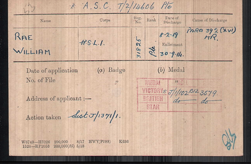 His regimental number was 31825, he joined the Kings Shropshire Light Infantry on 30th September 1914 (2 months after the war started) and served until 8th February 1919. He was awarded the British & Victory medals.